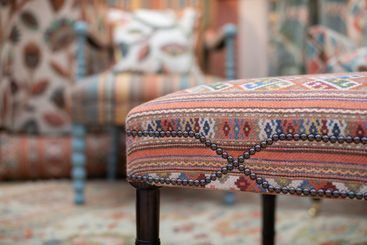 One of the highlights was the Florella Velvet – Blue Moss armchair. The cascade of Art Deco-inspired blooms printed on luxurious velvet brought energy and vibrancy to the space, while echoing Charleston’s hand-painted interiors. The bobbin armchair in Tilton Stripe – Iberian Tile introduced rhythm and movement with its multi-coloured vertical stripes and intricate warp detail, reflecting Charleston’s handcrafted charm.