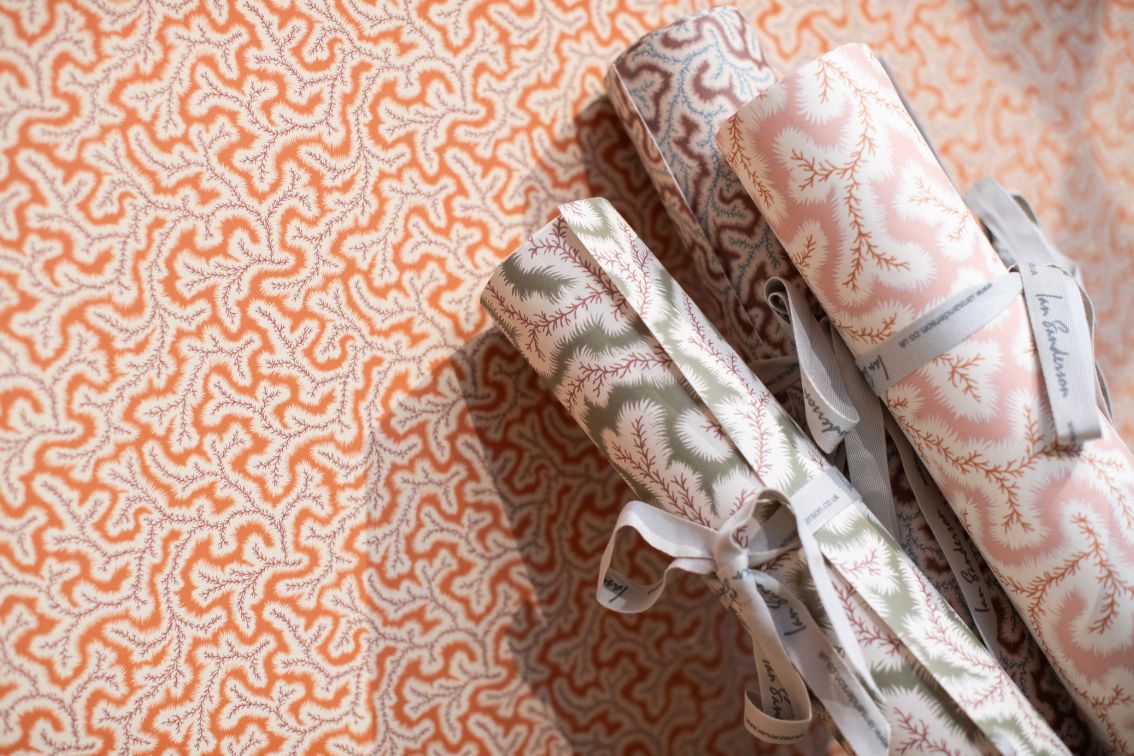 To introduce our collection, we collaborated with furniture from David Seyfried, whose elegant, handcrafted pieces provided the perfect foundation for our latest fabrics. The Thurloe Sofa, upholstered in Swing – Masala, anchored the room with its rich, painterly movement, while the Astell Chair in Olmo – Tamarind brought a soft, organic rhythm. The Arlington Stool, covered in Elney – Chocolate, added a grounding note of texture, and the Salvesen Graham Chair, in Miss Polly – Carrot and Persimmon, introduced a joyful burst of colour and character.