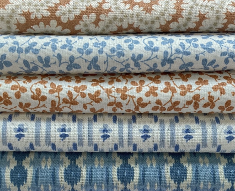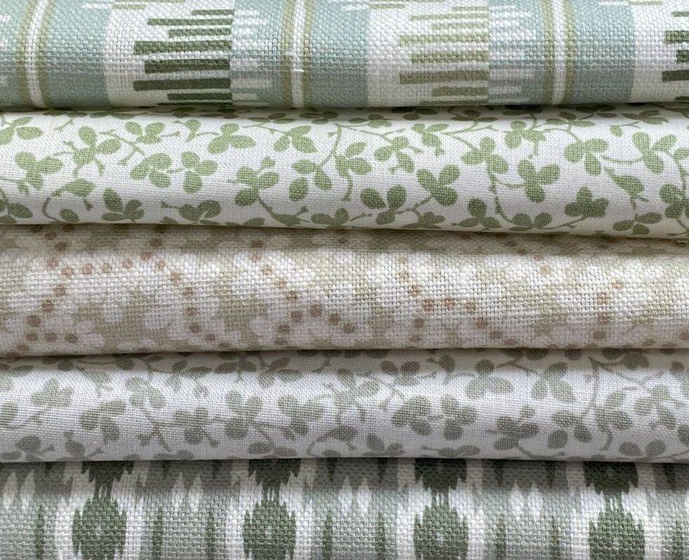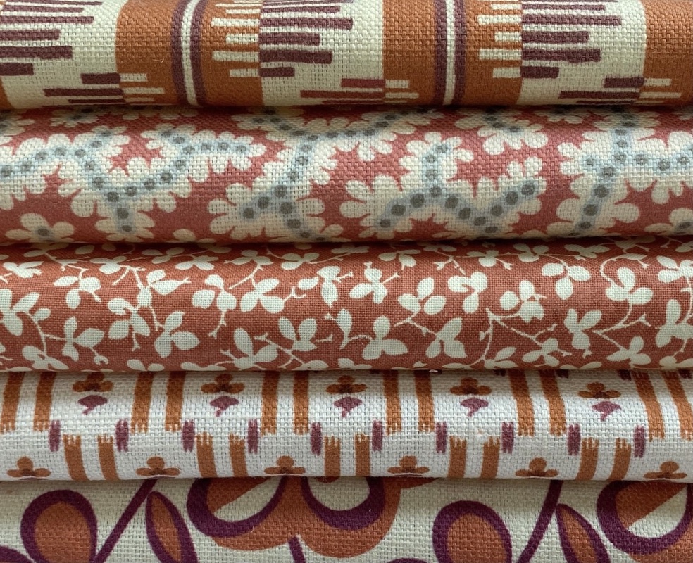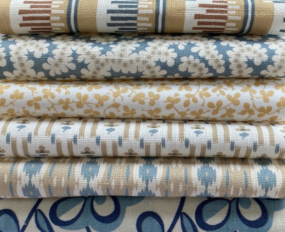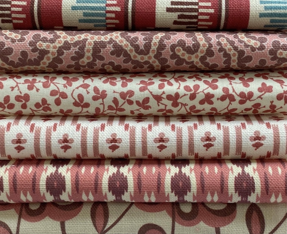 Beyond Complements is a new member of our Complements family of really useful small – medium scale printed designs. Six more original designs from our archive and studio are slightly larger in scale and explore new colour combinations, ground cloths and finishes. Olmo, Elney, Nettie, Reel Stripe and Swing are printed on our new cotton/linen, suitable for all soft furnishing and great for upholstery too. Charming Miss Polly, a delicately placed leaf design is printed on pure cotton with a light chintz glaze to add lustre and body.