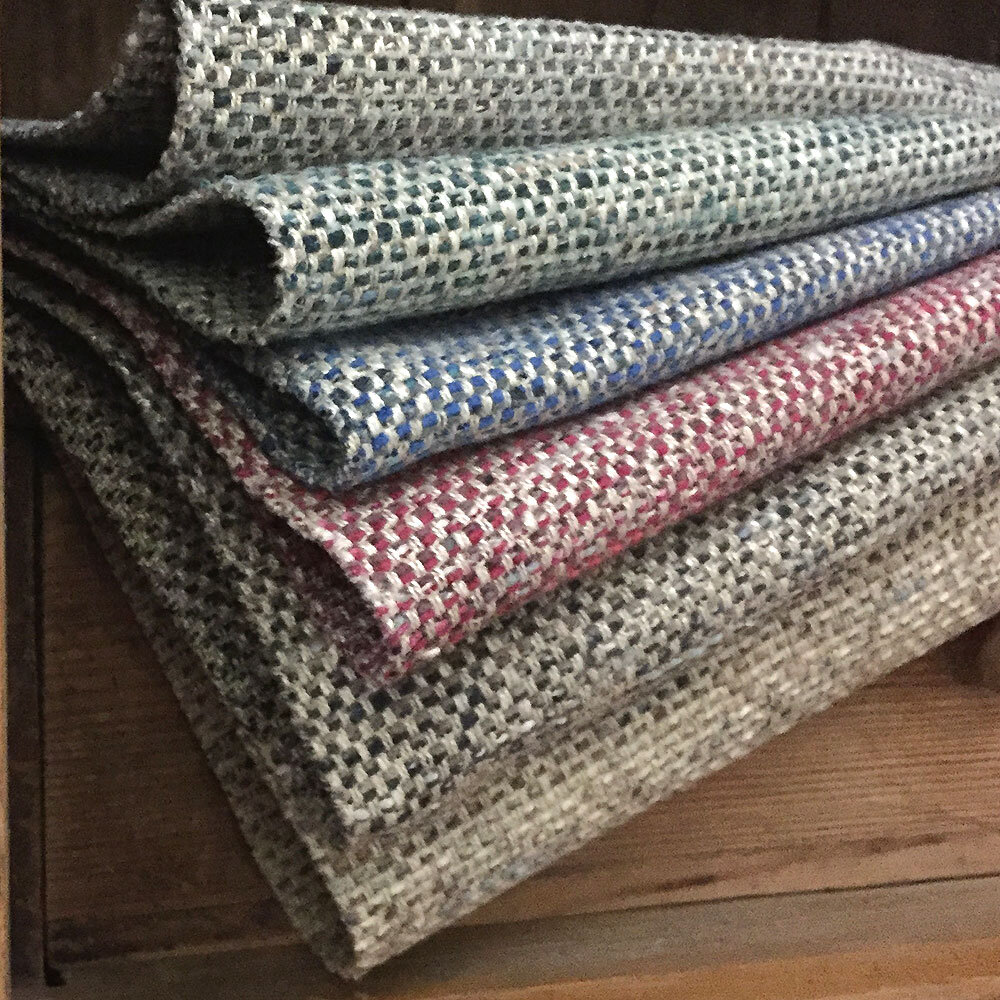 Basket weave semi-plain on a natural viscose and linen warp, with an abundance of innovative spun dyed fancy yarns, to give both vertical and horizontal texture