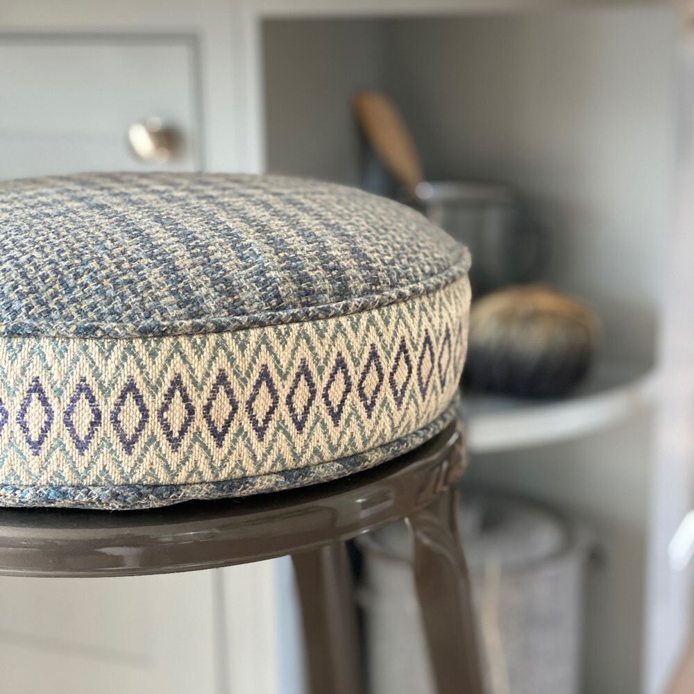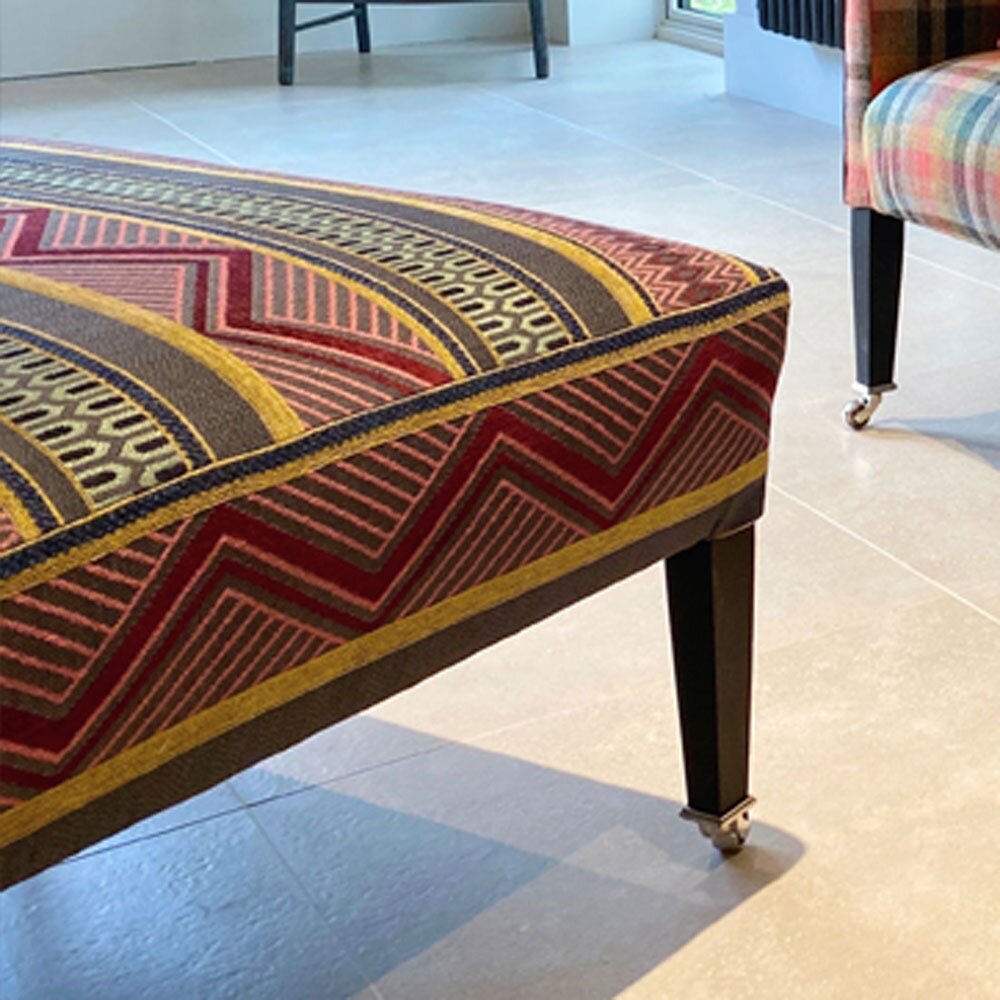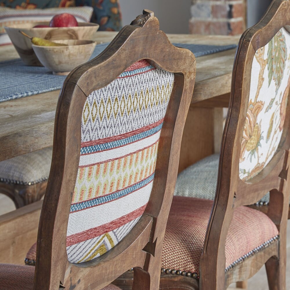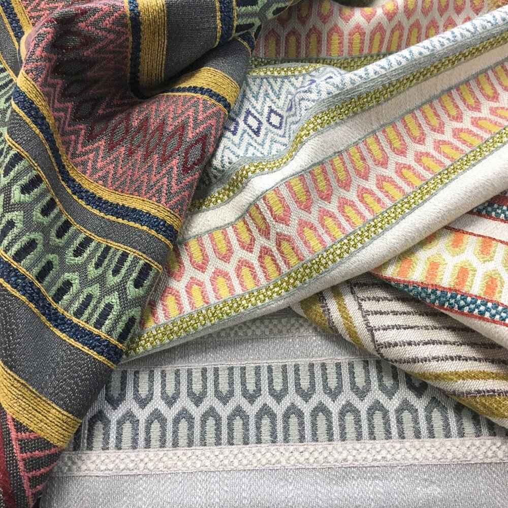 A large scale horizontal striped design with geometric elements of zig zag, lozenge and chequer board woven in viscose chenille, cotton and linen. A strident upholstery fabric in four colour ways.