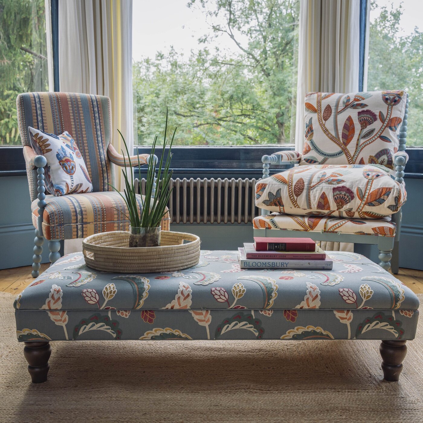 Palm Wave is a layered crewel work-style embroidery in stylized blocks of colour, highlighted with rayon to enhance its Deco-inspired palm leaf design. The striking and strong colours are beautifully displayed on a cotton and linen ground, offering both durability and a luxurious feel.