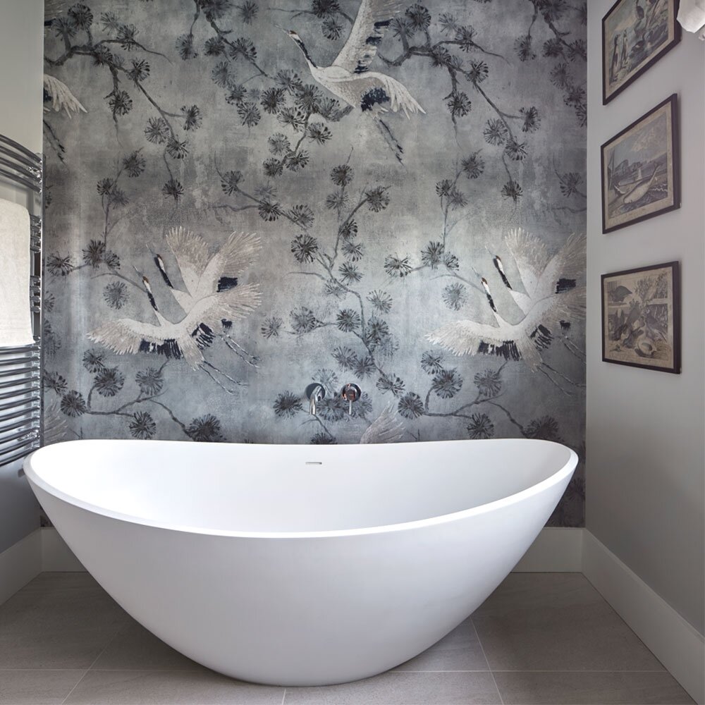 A feature wallpaper printed on mica paper for a glamorous & shimmering ethereal feel.