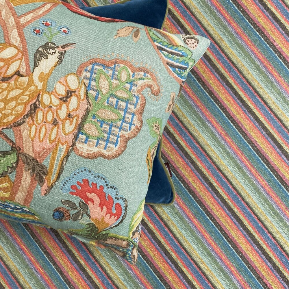 Julian’s technicoloured dream warp!Herringbone woven wool in a wildly irregular ( but in repeat ) vertical stripe. Created in Scotland.