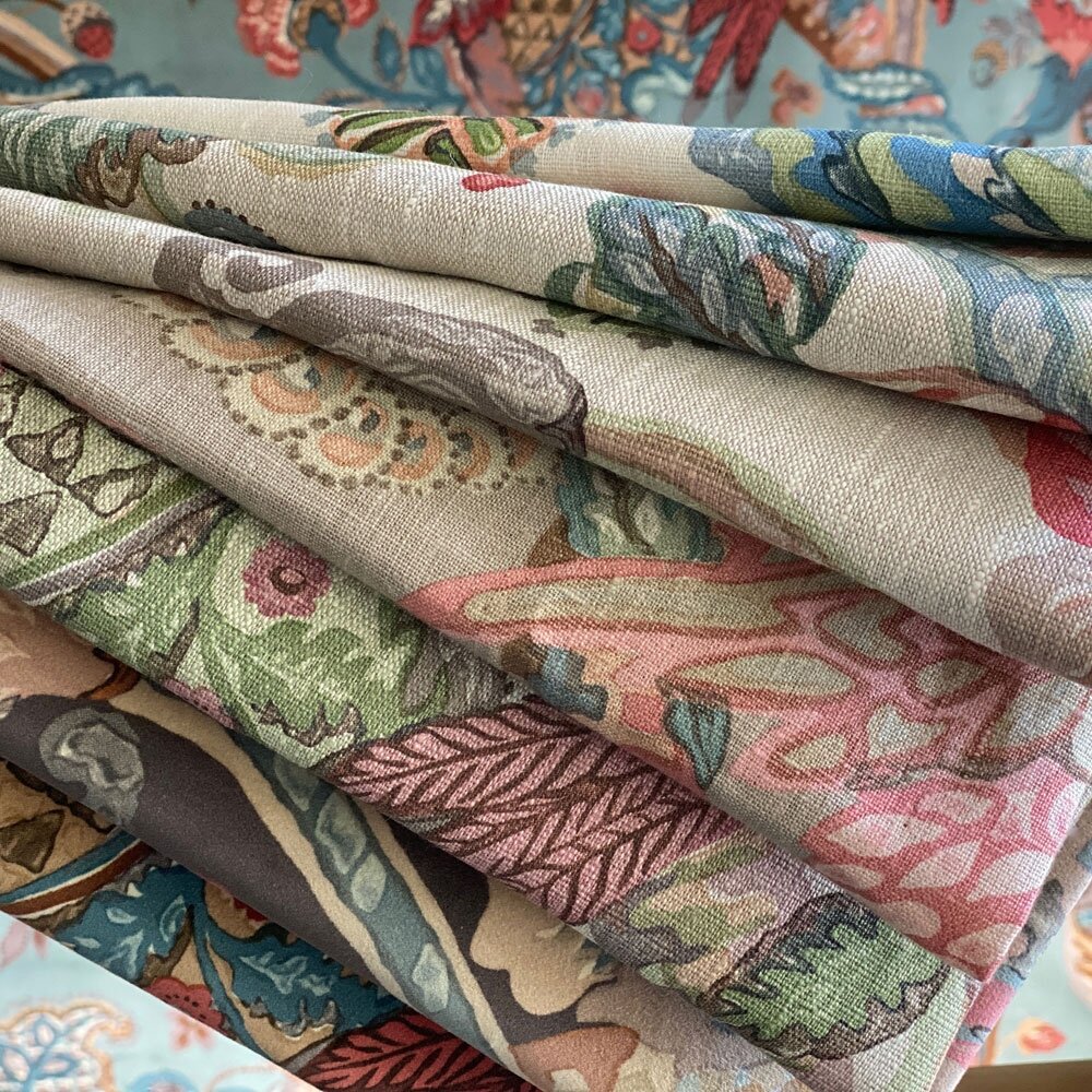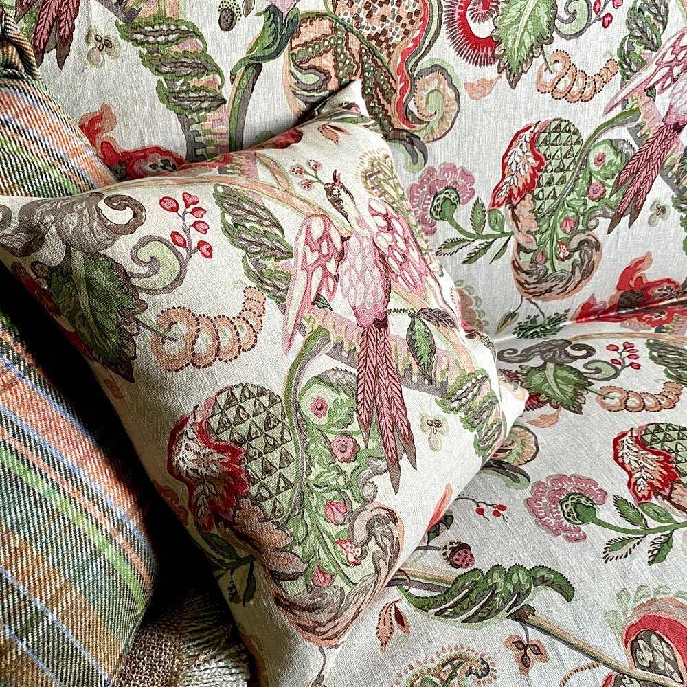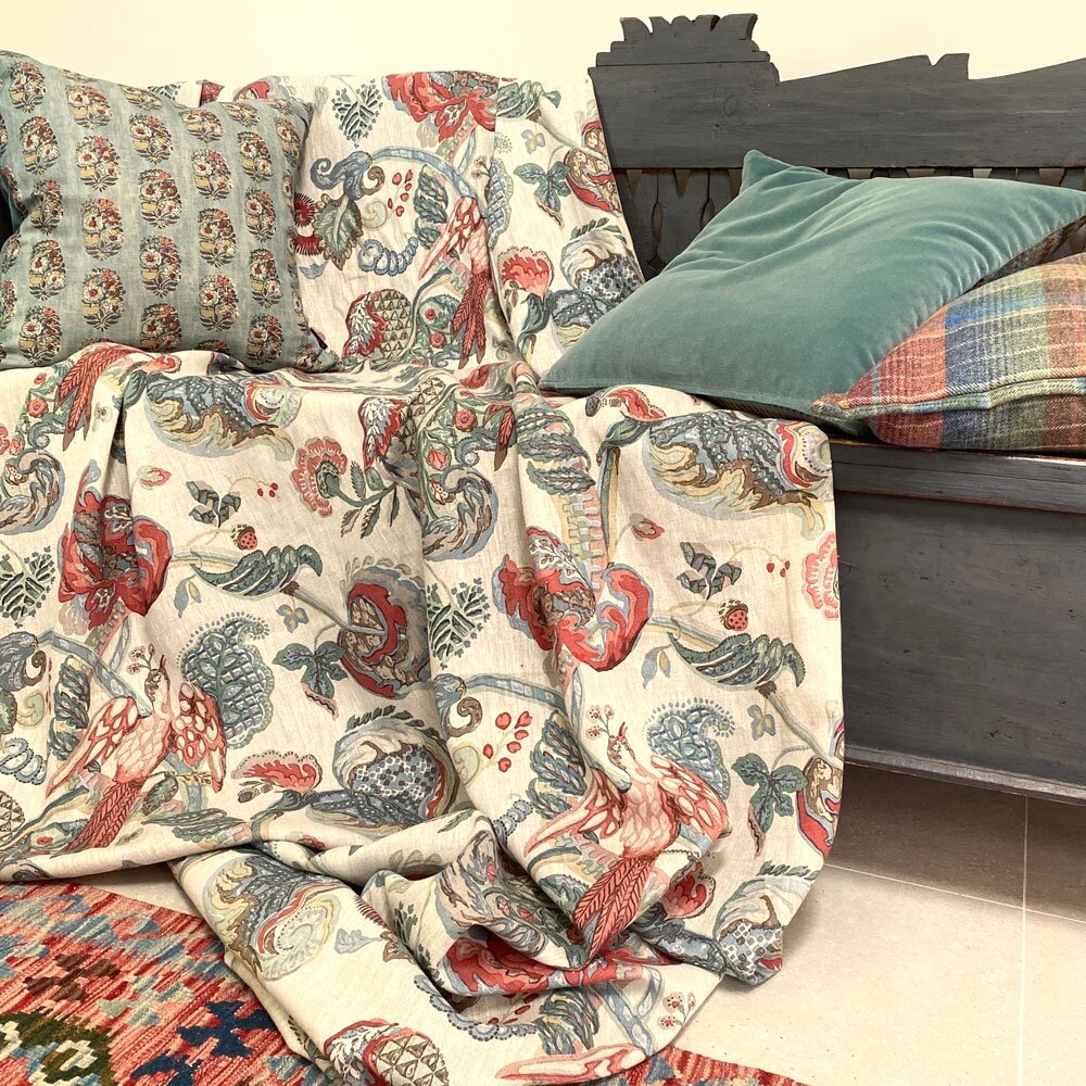 We are delighted to re-launch our iconic Poppinjay bird print with a selection of seductive new colours in both linen and velvet