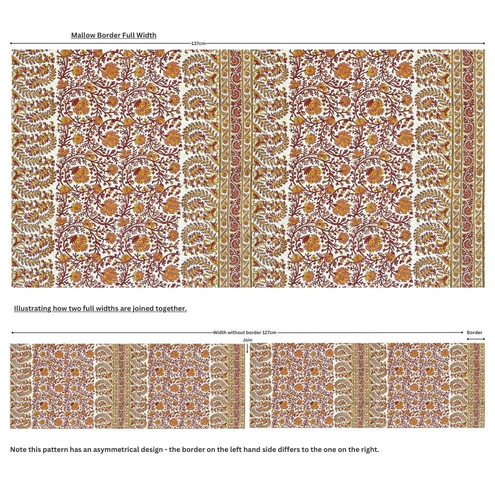 A testament to the Indian art of hand block printing, a fabulous design showcasing intricate patterns influenced by centuries old cultures and traditions. The design incorporates, flower and foliage meandering trail panels with a central extravagant border of stylised buteh and repeated borders at the selvages. Each pigment printed colour represents a wooden block carved and placed by hand and shows natural variations in pattern, colour and texture which signifies authenticity rather than defects.