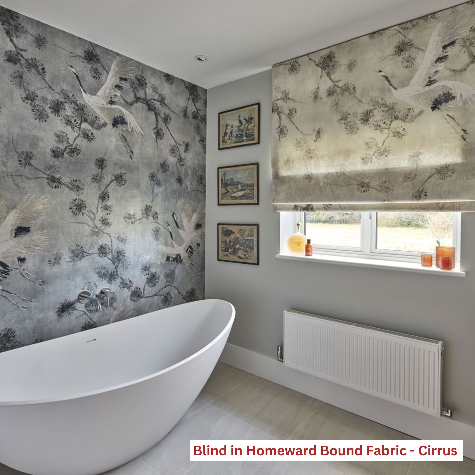An elegant design featuring graceful cranes taking off into the sky amongst delicate pine trees. Homeward Bound adds feature and timeless calm to any scheme.