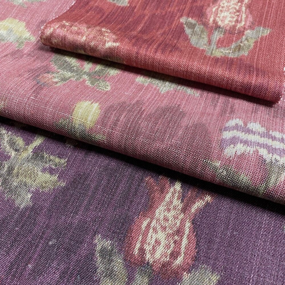 A special construction is used to create this fabric, where the design is printed onto the unwoven cotton warp (the vertical yarns make up the base of the fabric) and the fabric is then woven with a natural colour linen weft.