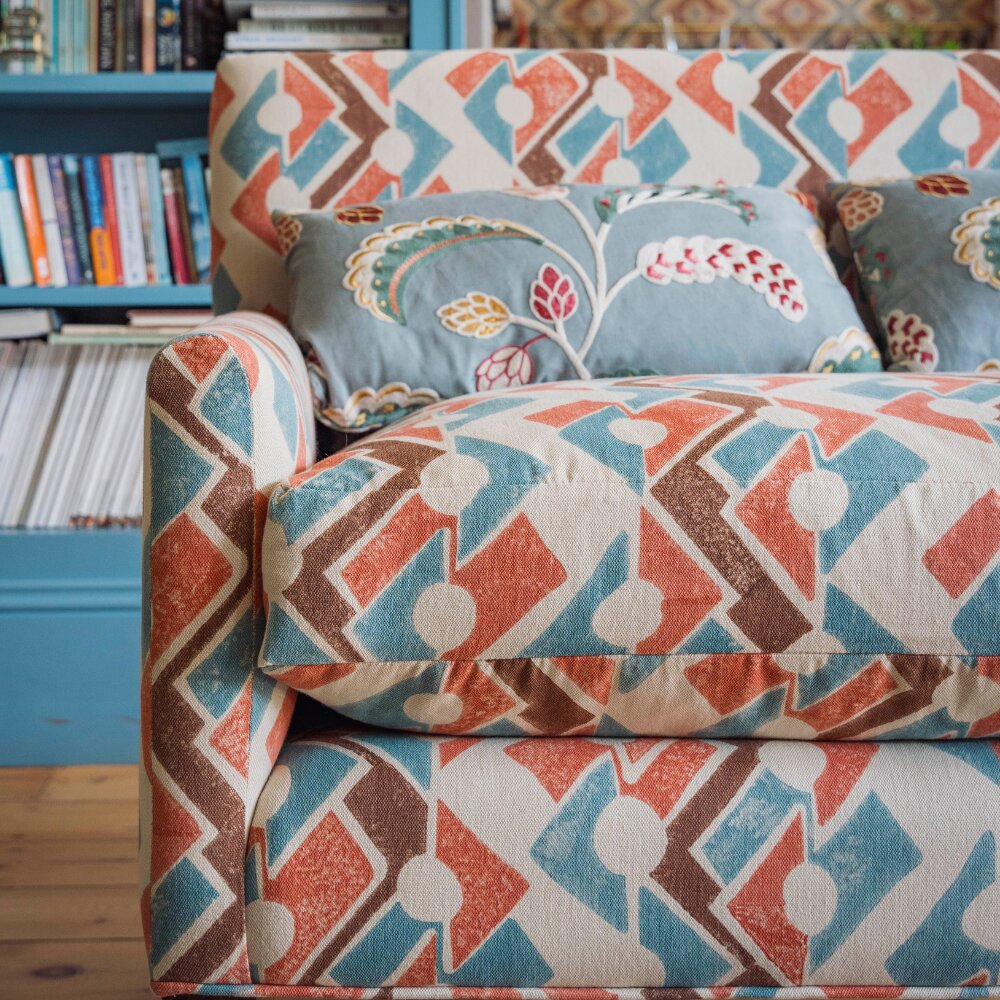 Click is a unique artisan-crafted fabric featuring hand-block printed vertical geometric shapes, rendered in three distinctive colours across five captivating colourways. Printed on specially woven thick cotton, the textured surface enhances the vibrancy of the pigment colours, creating a rich and dynamic fabric.
