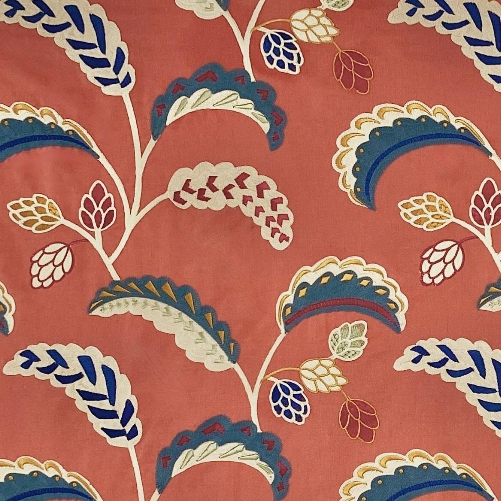 Palm Wave is a layered crewel work-style embroidery in stylized blocks of colour, highlighted with rayon to enhance its Deco-inspired palm leaf design. The striking and strong colours are beautifully displayed on a cotton and linen ground, offering both durability and a luxurious feel.
