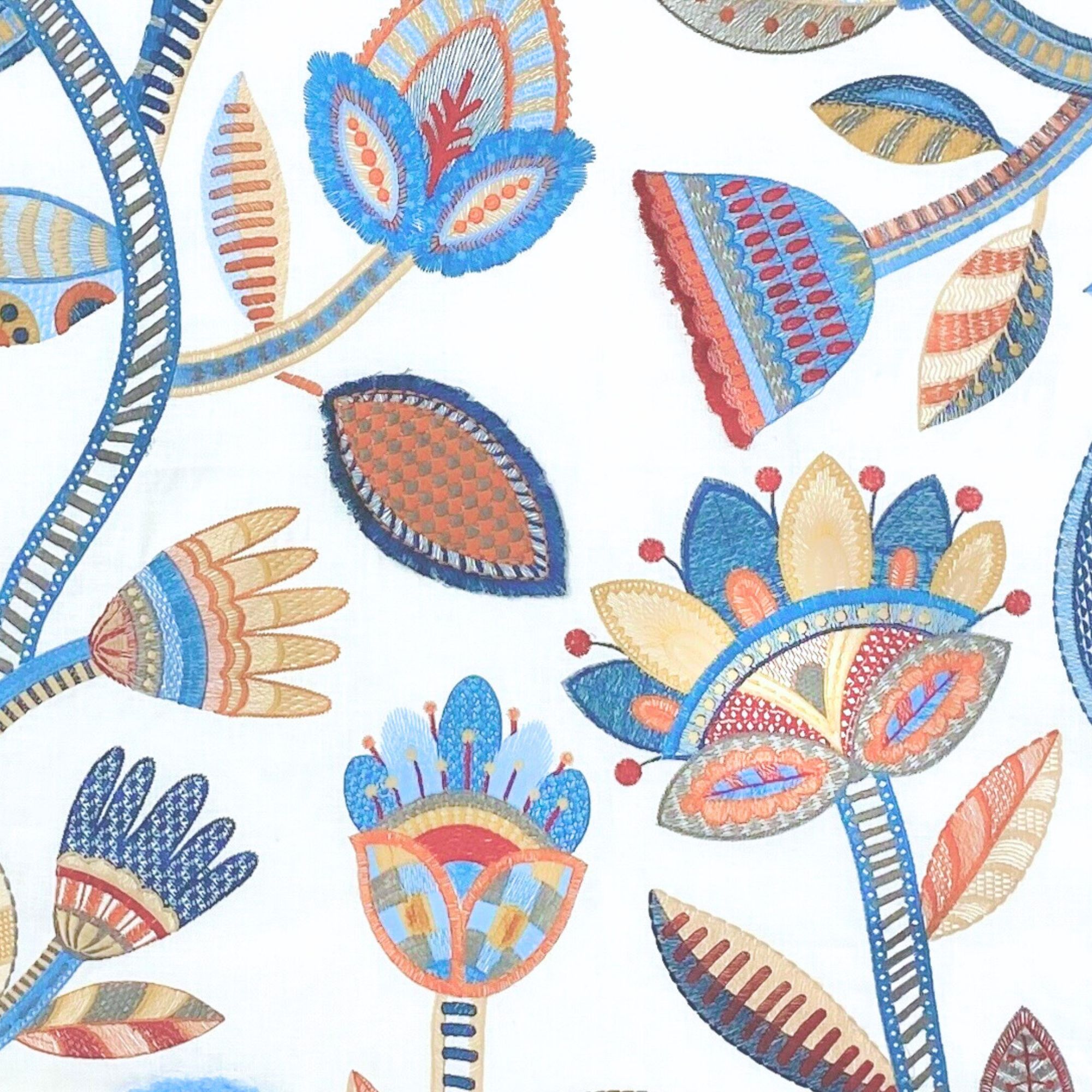 Sylvan is a striking and bold fabric featuring a mesmerizing tree of life design, beautifully embroidered on natural textured linen. The wonderfully detailed stitching brings this enchanting, folk-inspired design to life, available in five colourways.