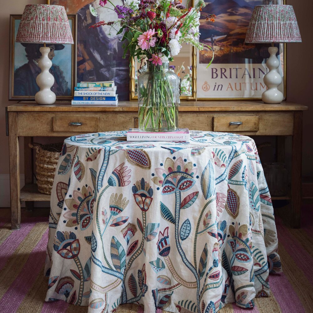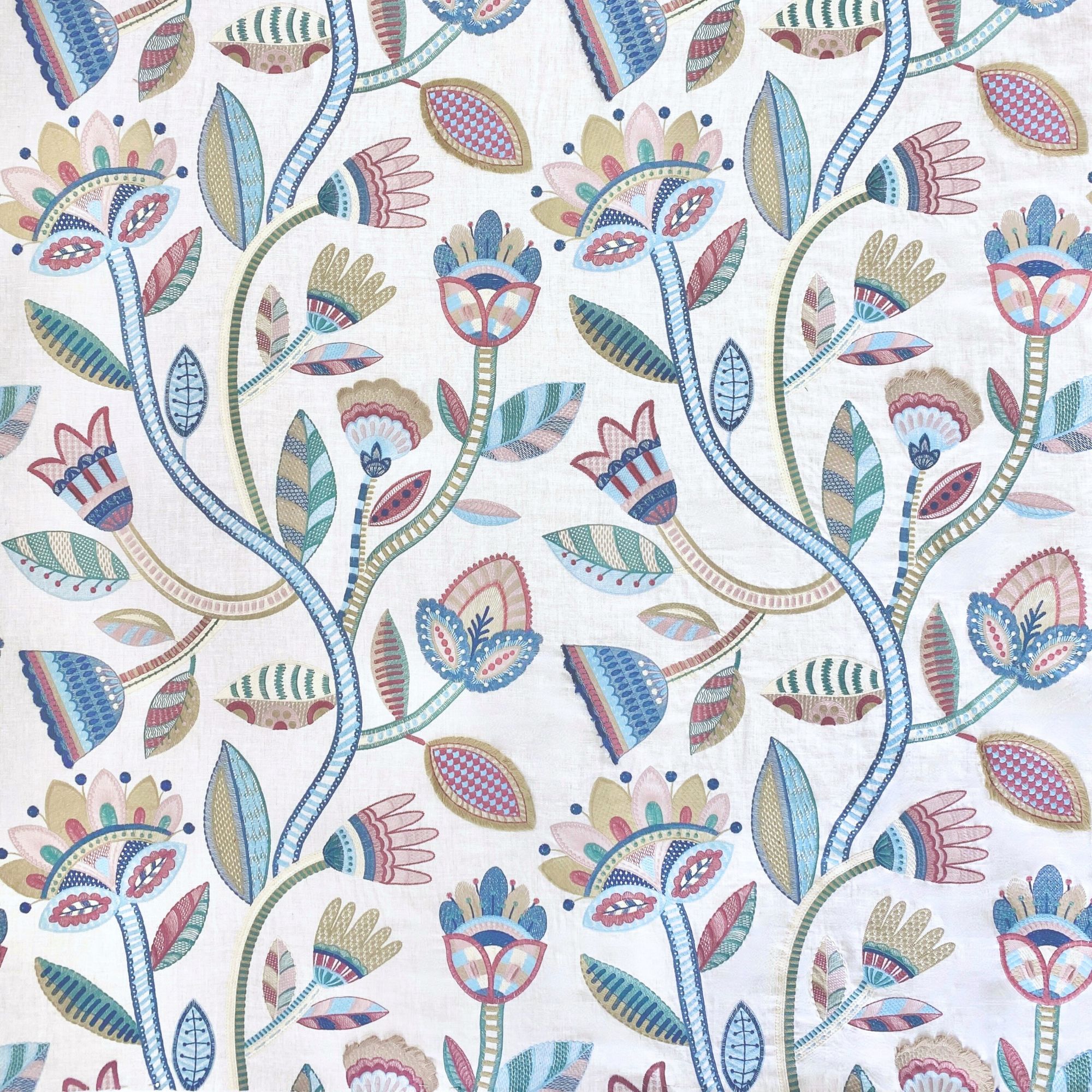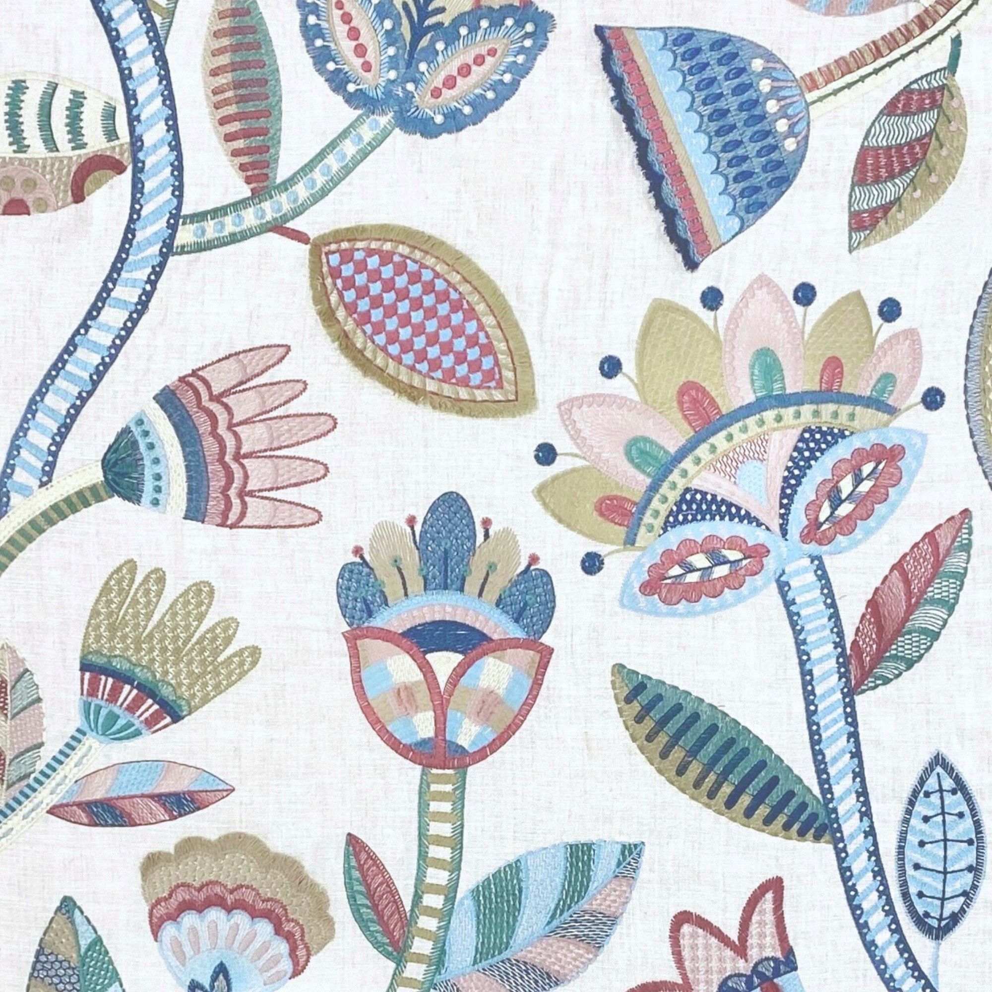 Sylvan is a striking and bold fabric featuring a mesmerizing tree of life design, beautifully embroidered on natural textured linen. The wonderfully detailed stitching brings this enchanting, folk-inspired design to life, available in five colourways.