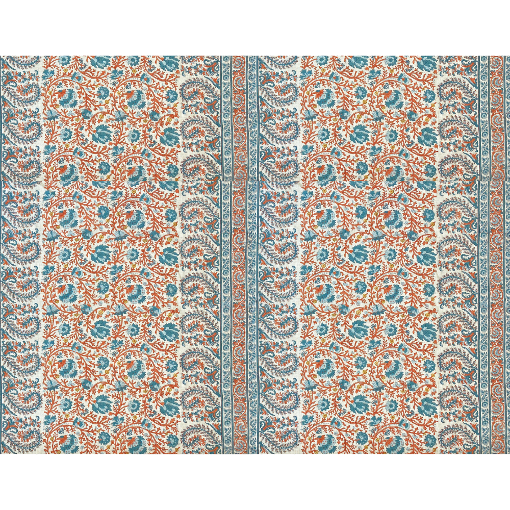 A testament to the Indian art of hand block printing, a fabulous design showcasing intricate patterns influenced by centuries old cultures and traditions. The design incorporates, flower and foliage meandering trail panels with a central extravagant border of stylised buteh and repeated borders at the selvages. Each pigment printed colour represents a wooden block carved and placed by hand and shows natural variations in pattern, colour and texture which signifies authenticity rather than defects.