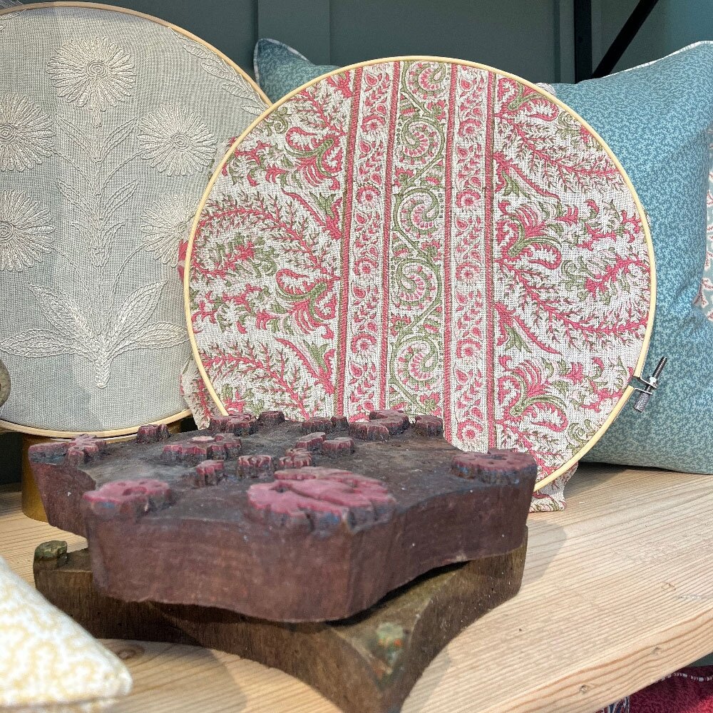 A testament to the Indian art of hand block printing, a fabulous design showcasing intricate patterns influenced by centuries old cultures and traditions. The design incorporates, flower and foliage meandering trail panels with a central extravagant border of stylised buteh and repeated borders at the selvages. Each pigment printed colour represents a wooden block carved and placed by hand and shows natural variations in pattern, colour and texture which signifies authenticity rather than defects.