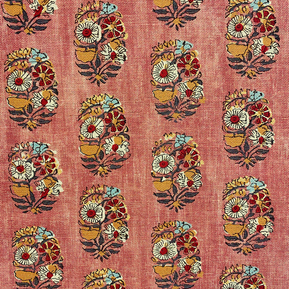 | Description: | Paisley inspired posy of stylised flowers with wood block texture and line work. Natural or bleached linen and cotton ground shades are enhanced with colour and textured print creating a modern, but rustic medium scale print. |