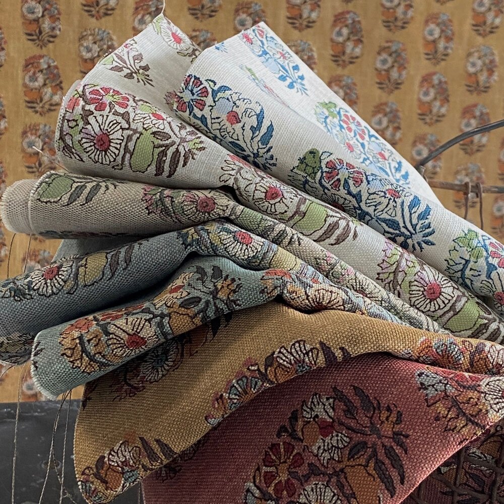 Natural or bleached linen and cotton ground shades are enhanced with colour and textured print creating a modern, but rustic medium scale print.