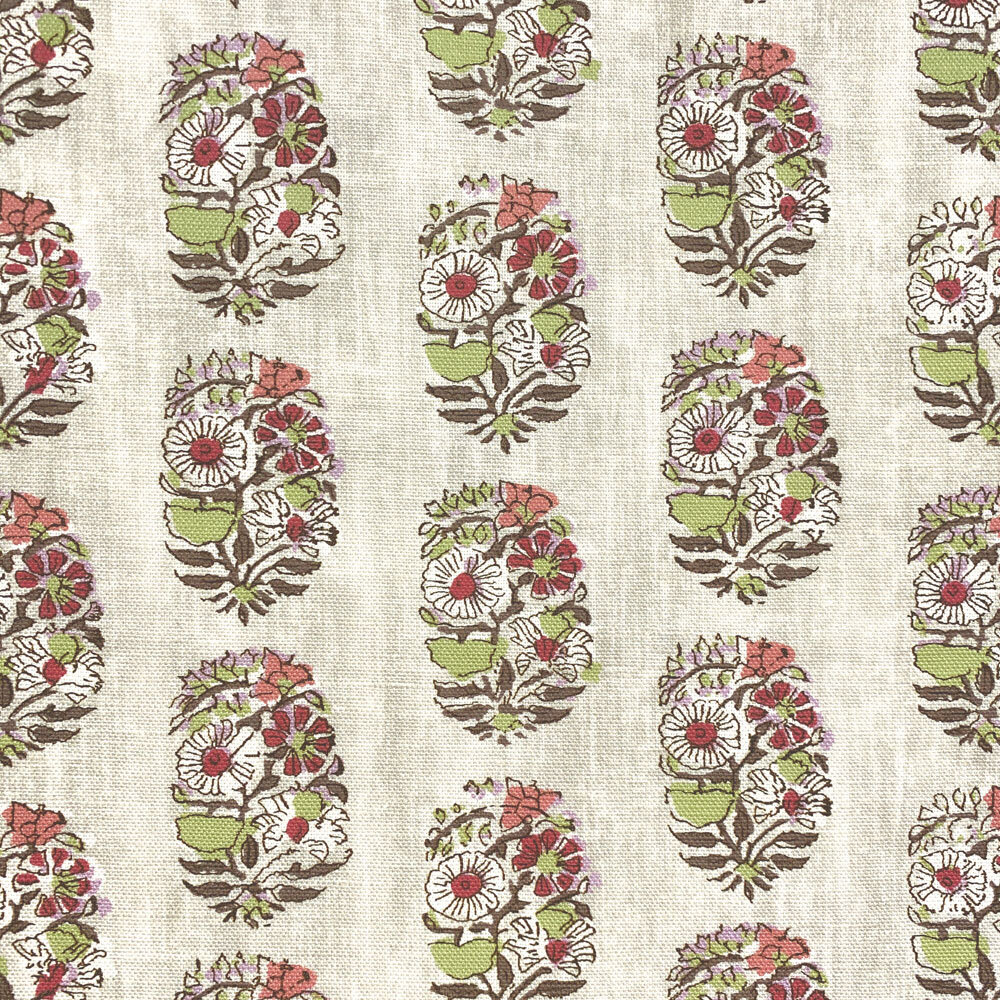 | Description: | Paisley inspired posy of stylised flowers with wood block texture and line work. Natural or bleached linen and cotton ground shades are enhanced with colour and textured print creating a modern, but rustic medium scale print. |