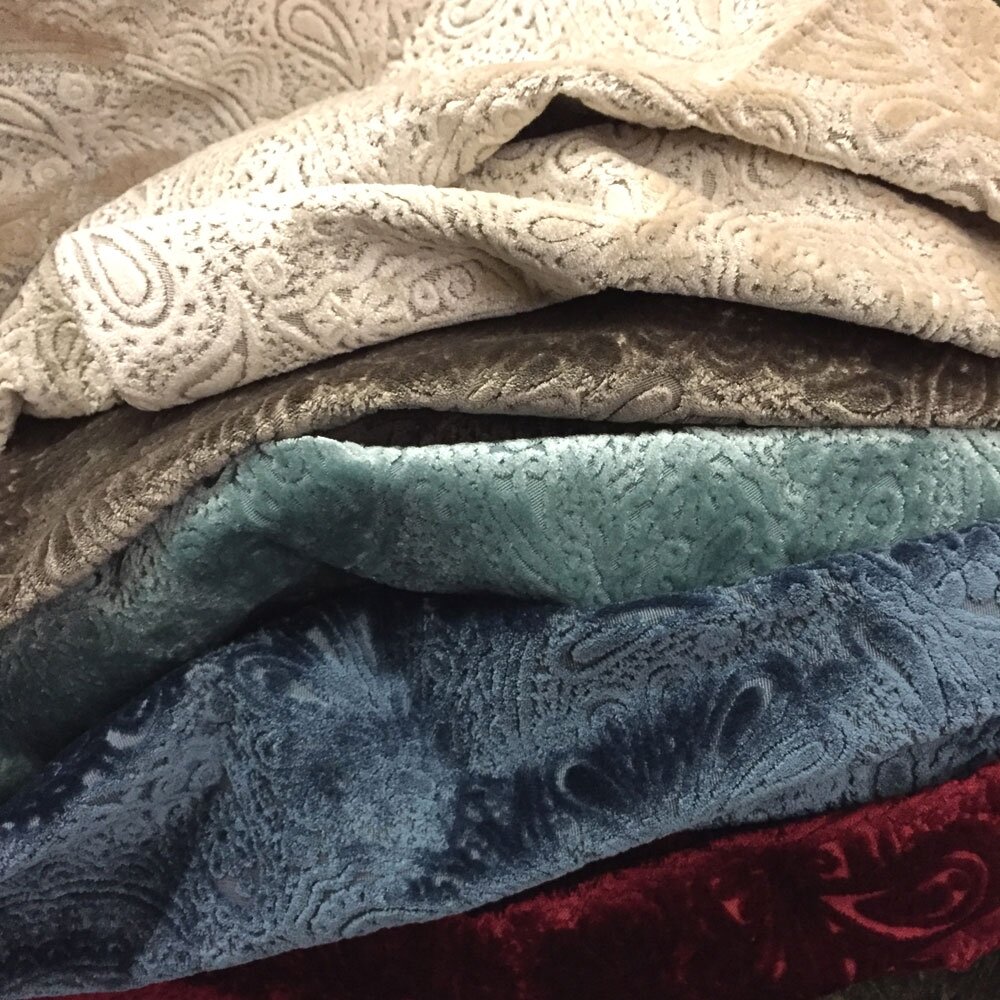 Lustrous velvet with a paisley design cut pile, available in 6 opulent colours.