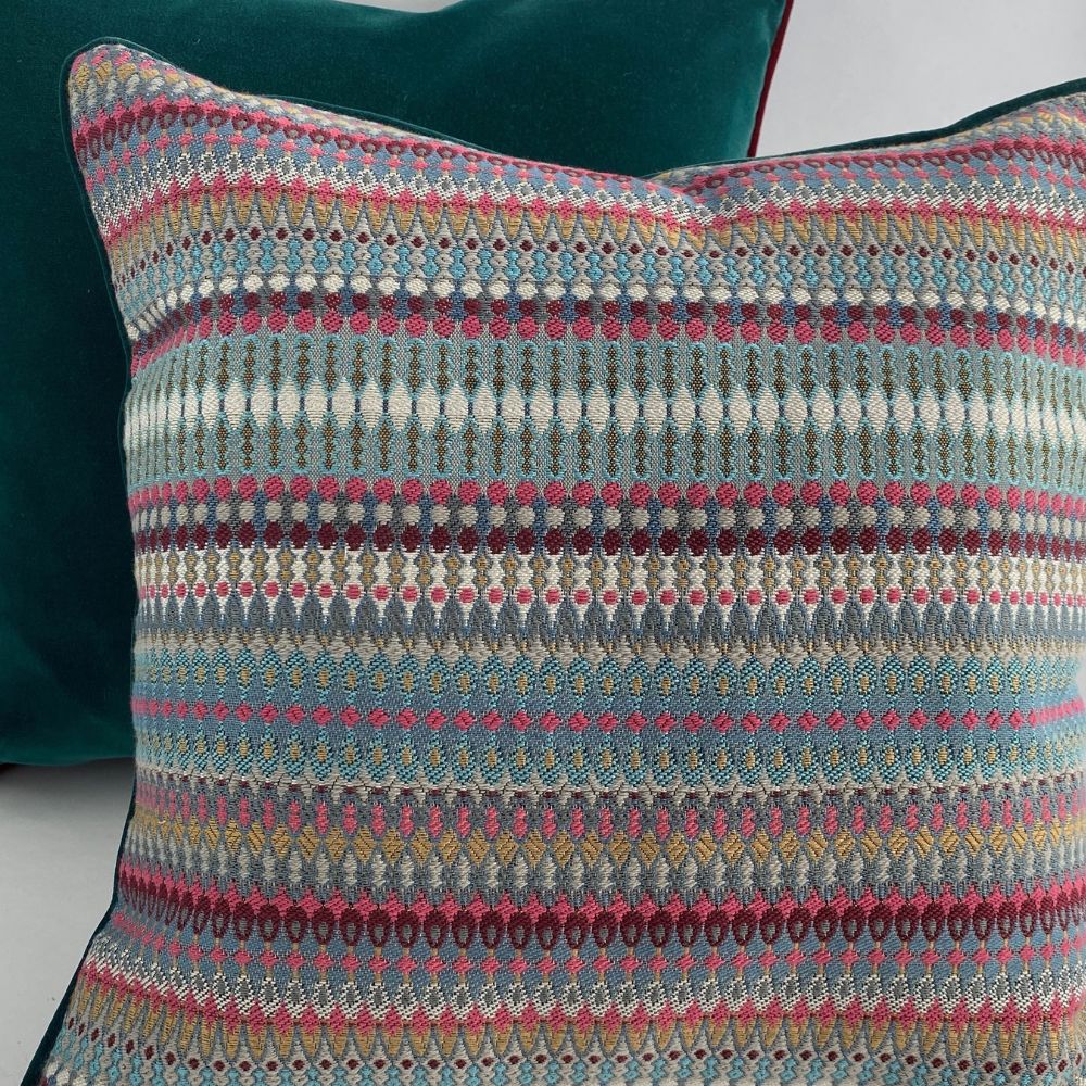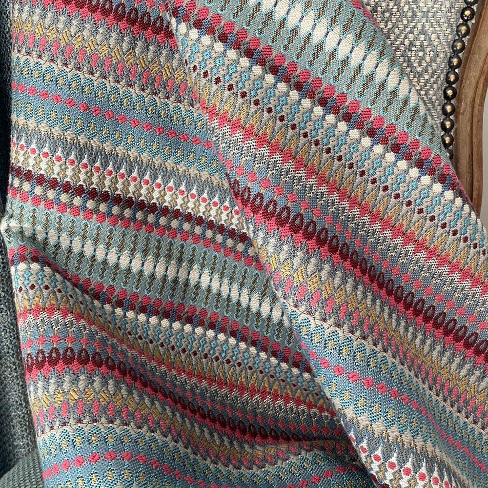 Created by weaving together bold and subtle shades through a range of geometrical shapes in horizontal stripes