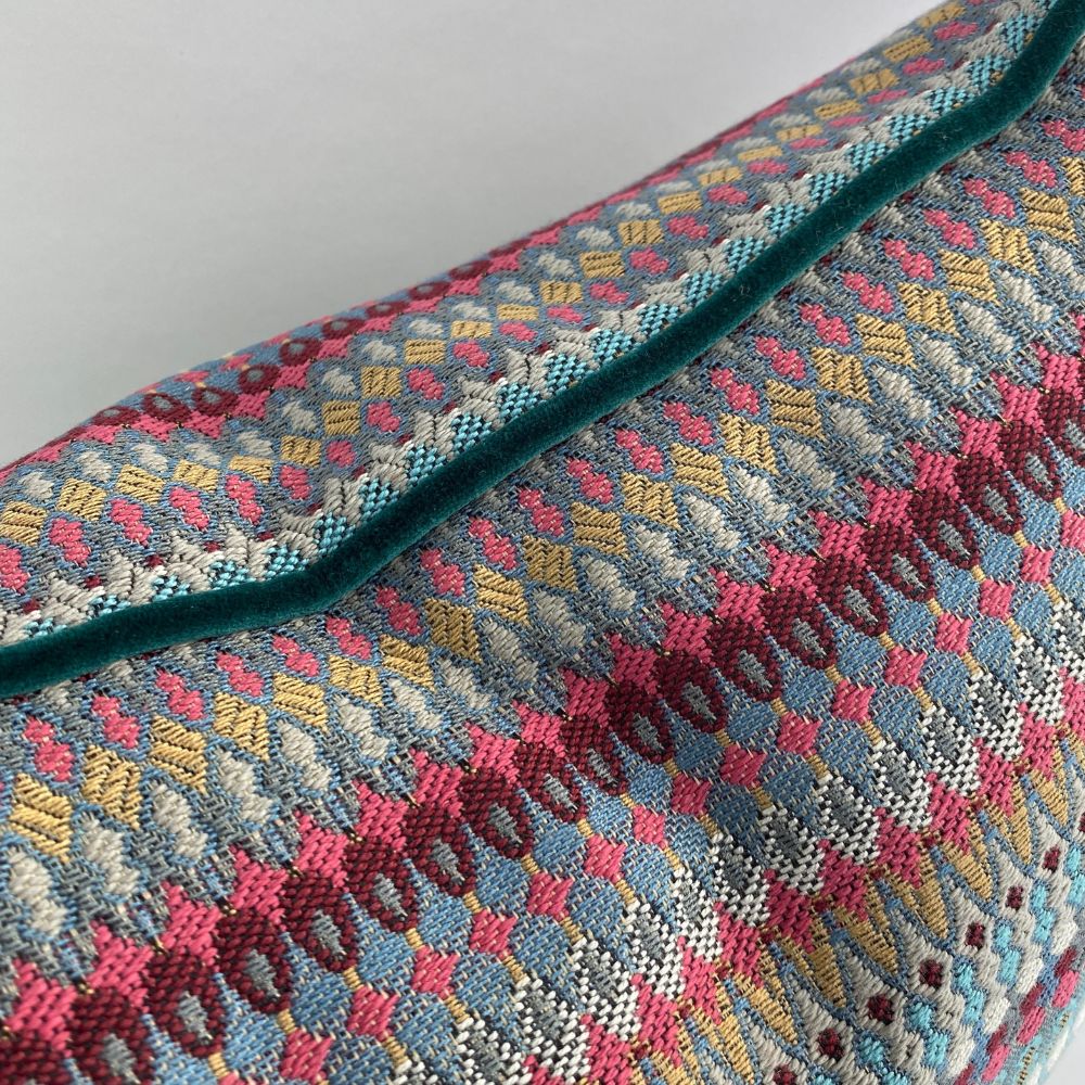| Description: | Created by weaving together bold and subtle shades through a range of geometrical shapes in horizontal stripes |