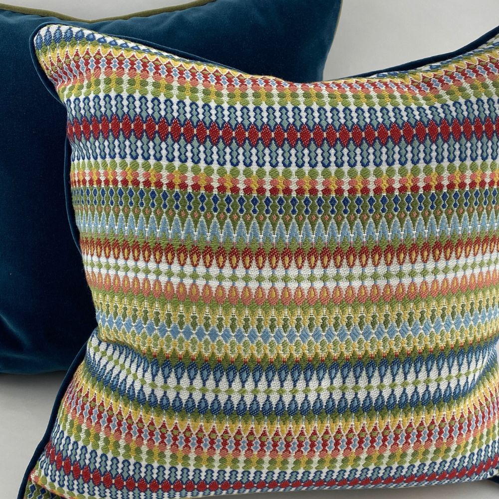 Created by weaving together bold and subtle shades through a range of geometrical shapes in horizontal stripes