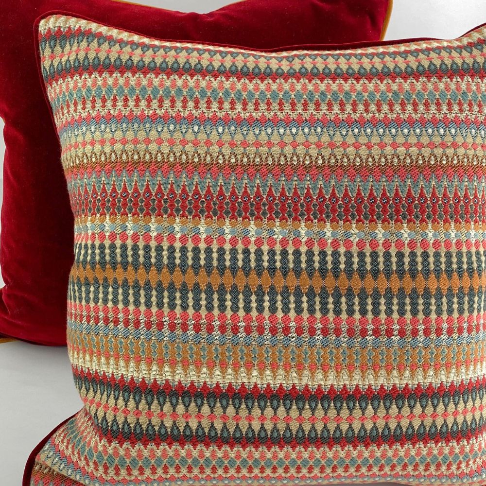Created by weaving together bold and subtle shades through a range of geometrical shapes in horizontal stripes