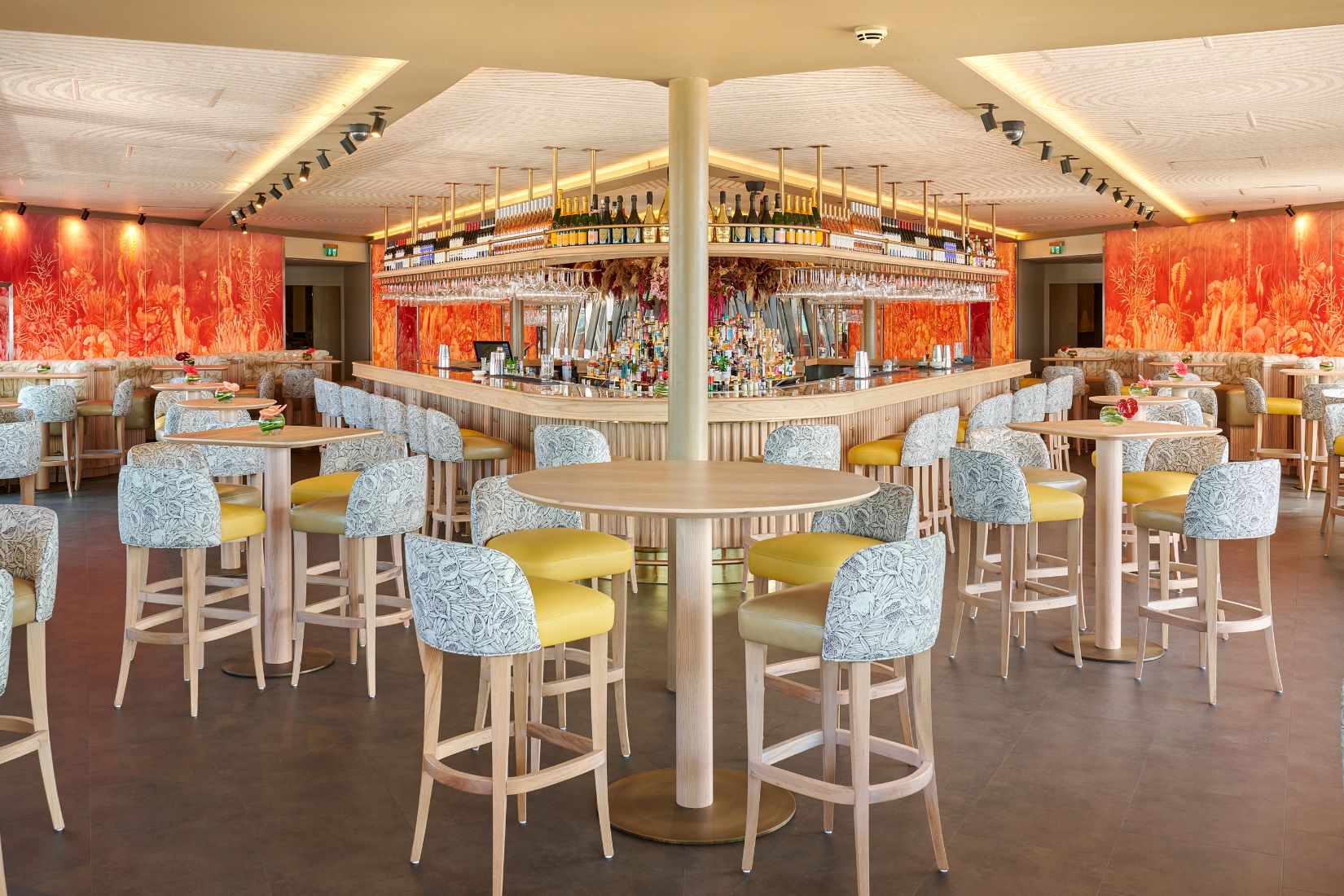 Covering the seating of this design-led setting, we’re proud to see Melograno – Stone integrated so seamlessly. Part of our decorative performance collection, Melograno features a woodcut-inspired pomegranate motif. In the Stone colourway, the fabric offers a neutral yet textured backdrop that softens the contemporary edge of the bar area.